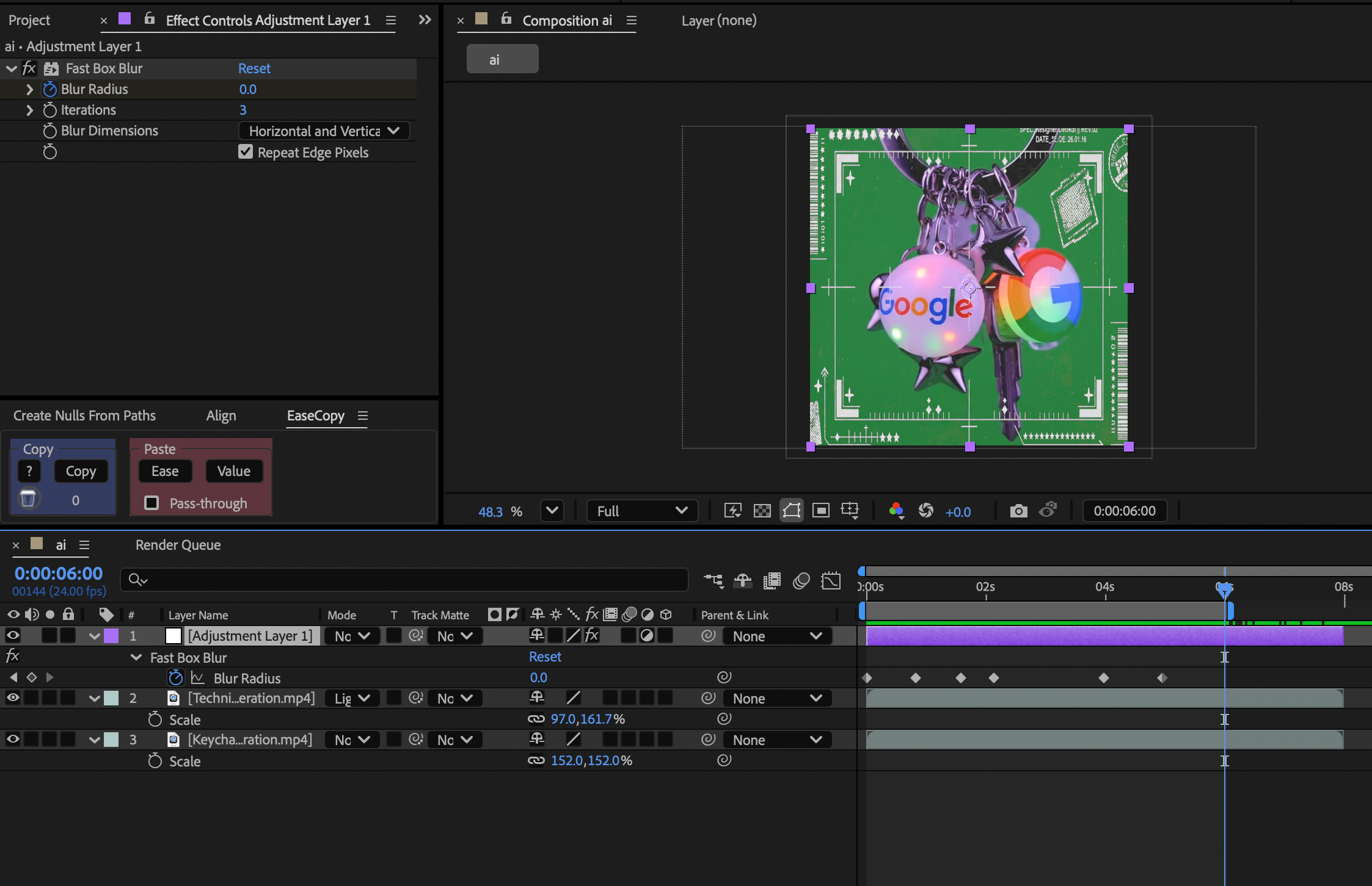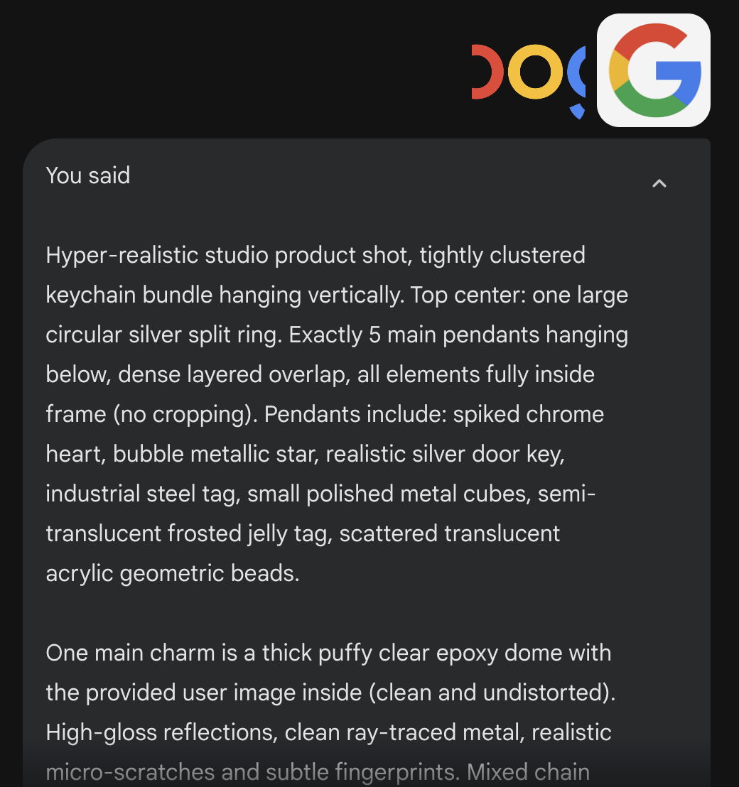 This is a small experiment I conducted using Google's AI (Gemini ) : First, I used instructions to generate a technical interface framework "like a camera lens/viewfinder." Then, using the Google logo as input, I had the AI generate a set of metallic-looking keychain bundles (including epoxy dome, metal pendants, chains, etc.), and used a green screen background for easier compositing later. Finally, I did some post-processing in After Effects (compositing, scaling rhythm, slight blur/grain overlay with UI) to refine it into a more product-like lens presentation.
